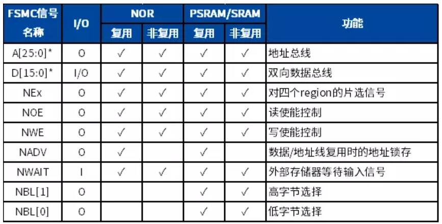 MM32F3270的FMSC外部接口信號(hào),可使用異步方式訪問SRAM,可以選用復(fù)用或非復(fù)用方式擴(kuò)展SRAM,還可以通過配置實(shí)現(xiàn)外擴(kuò)8位總線或16位總線接口的SRAM。目前市場(chǎng)上非復(fù)用型16位數(shù)據(jù)總線接口的SRAM/PSRAM較為普遍。