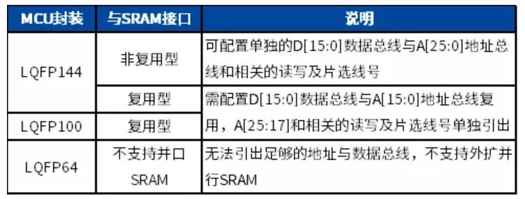 MM32F3270系列MCU因?yàn)榉庋b的原因,導(dǎo)致只有部分MCU產(chǎn)品可以通過硬件復(fù)用出全部或部分的FSMC接口的相關(guān)GPIO,才能支持外接SRAM存儲(chǔ)器擴(kuò)展存儲(chǔ)空間。其中LQFP144引腳封裝MCU芯片支持連接地址數(shù)據(jù)非復(fù)用和復(fù)用方式外擴(kuò)并行SRAM;而LQFP100引腳封裝芯片因地址線縮減,僅支持連接地址數(shù)據(jù)復(fù)用方式外擴(kuò)并行SRAM。LQFP64因?yàn)闊o法引出足夠的地址與數(shù)據(jù)總線,不支持外擴(kuò)并行SRAM。