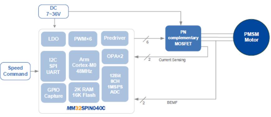 方案采用的主控MM32SPIN040工作頻率可達48MHz,內置16KB Flash,2KB SRAM高速存儲器,針對電機應用內置2個運放,預驅工作電壓高達36V。適合于三相永磁無刷電機,電動工具等多種應用場合。該方案適用于落地扇、塔扇、循環扇、吊扇等多種品類的風扇設備。我司英尚微可提供高速吹風筒、電扇等各種電機應用方案。