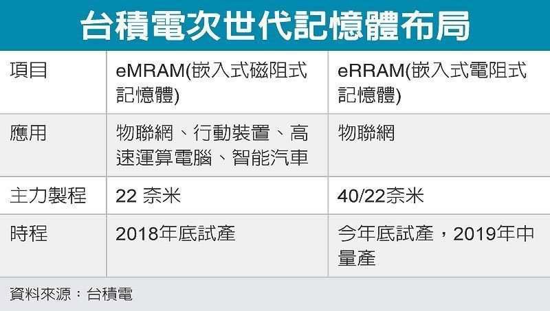 臺積電技術(shù)長孫元成近日在臺積電技術(shù)論壇上,第一次披露臺積電研發(fā)多年的eMRAM(嵌入式磁阻式隨機(jī)存取內(nèi)存)和eRRAM(嵌入式電阻式內(nèi)存),分別定于明后年實行風(fēng)險性試產(chǎn),主要使用22mn制程,這將是臺積電因應(yīng)高速運(yùn)算計算機(jī)、物聯(lián)網(wǎng)、行動裝置和智能汽車等四領(lǐng)域所供給效能更迅速和耗電更低的新內(nèi)存。