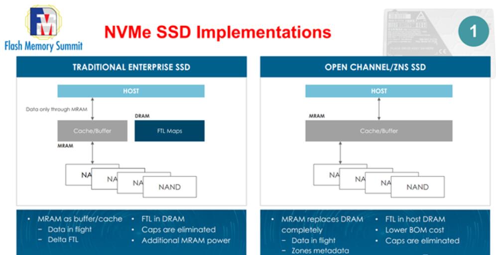 采用MRAM之后,NVMe SSD內部的架構發生了以下圖片的變化,將MRAM作為數據緩存使用,而FTL映射表存儲依然是DRAM: