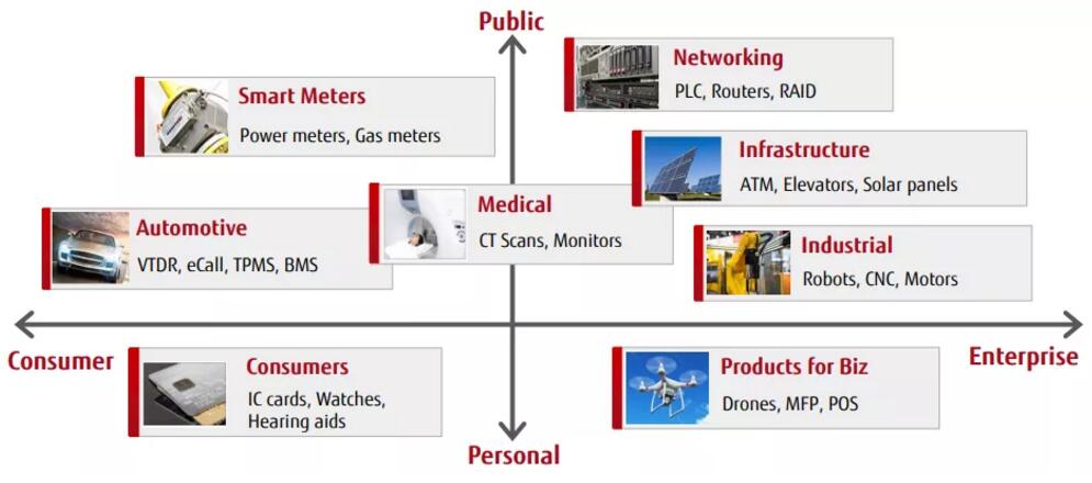 經過市場的長期廣泛驗證以及技術的不斷突破,富士通FRAM產品已成功應用于智能卡及IC卡等卡片領域、電力儀表及產業設備等工業領域,醫療設備及醫療RFID標簽等醫療領域、胎壓監測及新能源汽車電池管理系統等汽車領域等等,涉及的應用超過200種,幾乎覆蓋所有主要領域!
