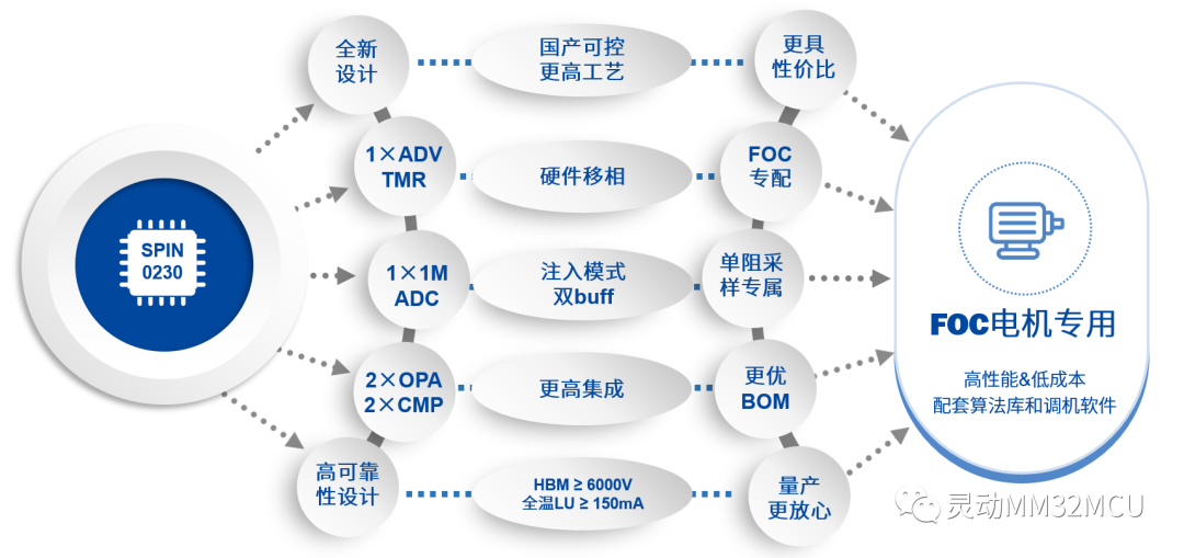 MM32SPIN0230內部集成了具有靈動特色的電機控制功能:高階4路互補PWM、注入功能的高精度ADC、軌到軌運放、輪詢比較器、32位針對霍爾傳感器的捕獲時鐘、以及硬件除法器和DMA等電機算法加速引擎。同時發布的兩款SOC產品,MM32SPIN030C和MM32SPIN080C內部更是集成了PN預驅、NN預驅、LDO等,使得應用者可以大幅度精簡板級器件。