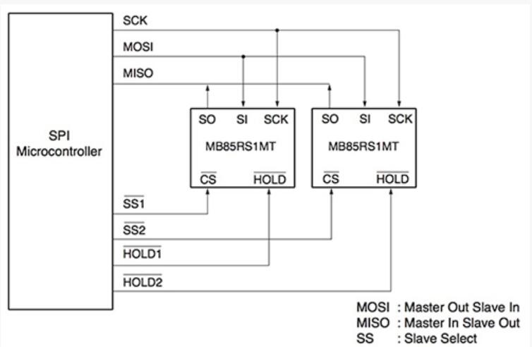 圖1:設(shè)備,如富士通MB85RS1MT允許使用熟悉的主/從配置為SPI-配備的MCU - 或使用使用設(shè)備的SI和SO端口,用于非基于SPI的設(shè)計(jì),簡(jiǎn)單的總線連接解決方案。 (富士通半導(dǎo)體提供)