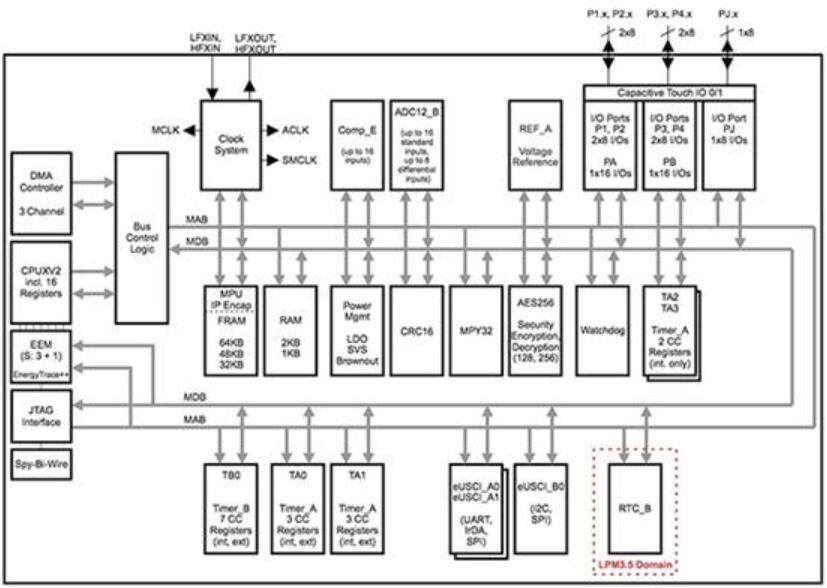 TI的MSP430FR5969是該公司低功耗MCU具有實(shí)質(zhì)性芯片F(xiàn)RAM存儲(chǔ)(圖2)。在主動(dòng)模式下,