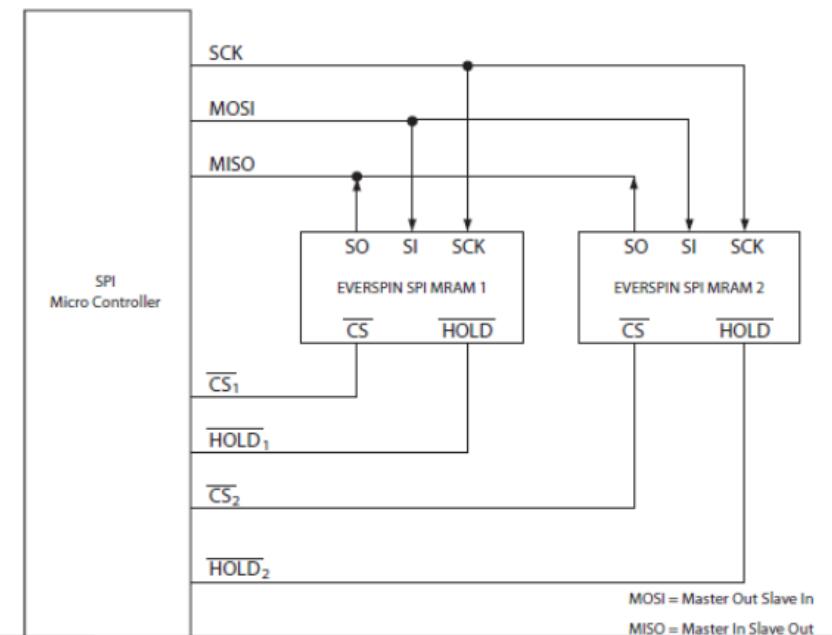 單個或多個器件可以連接到SPI總線,如下所示。引腳SCK,SO和SI是常見的設備。每個器件都需要分別驅動CS和HOLD引腳。